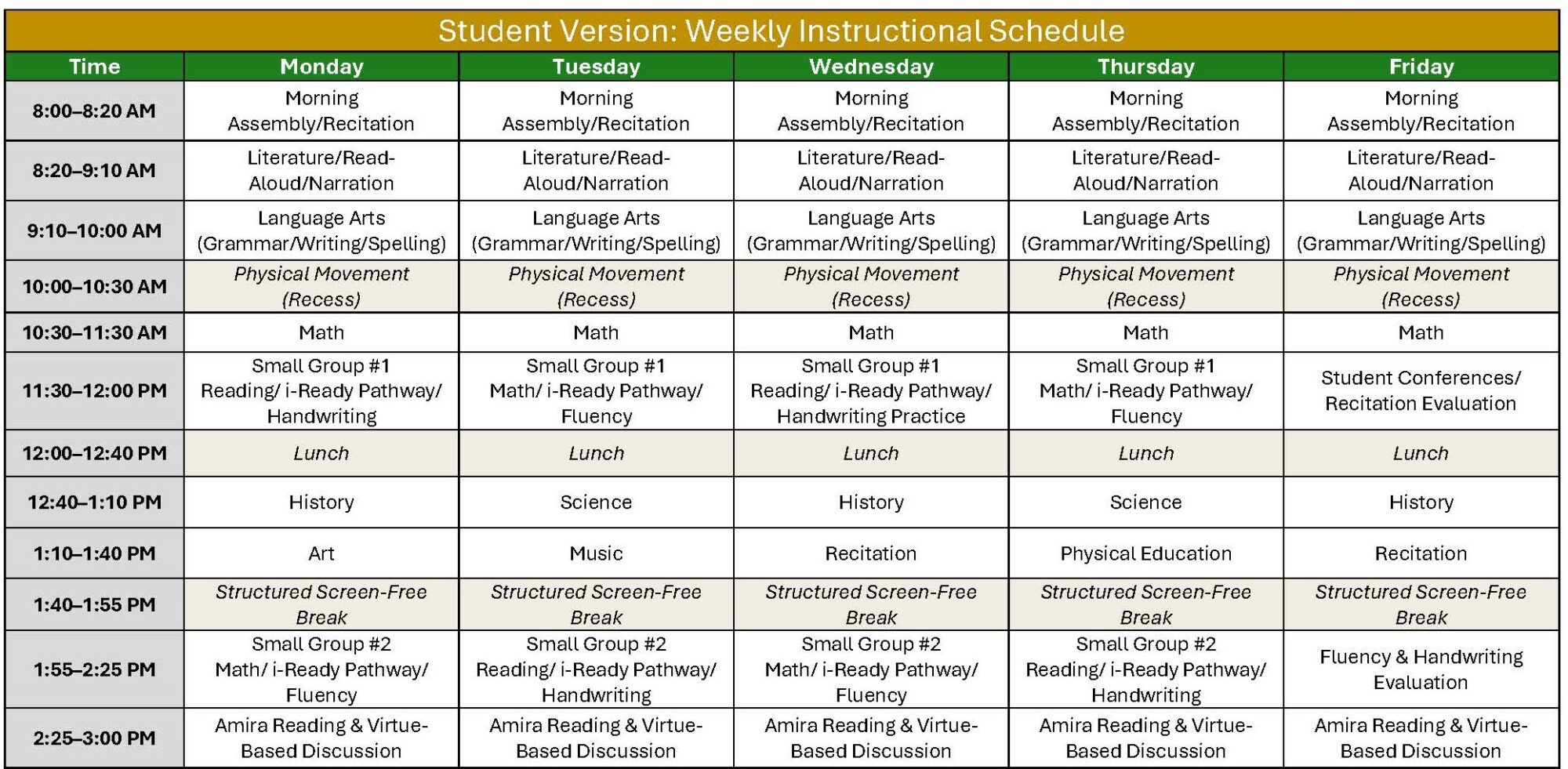 • Total Student Day (including breaks and lunch): 7 hours (420 minutes)